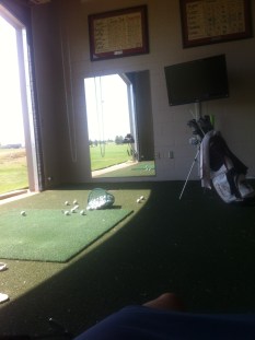 Hela gårdagen stod regnet som spö i backen och det var bara tio grader. Vad hände med att gå på golfbanan och svettas, allting är klibbigt och coach tjatar om solskyddsfaktor? Jag hoppas det fina vädret strax e tillbaka. Därför tränade vi från vårt hus på rangen där vi har fem stycken mattor.
