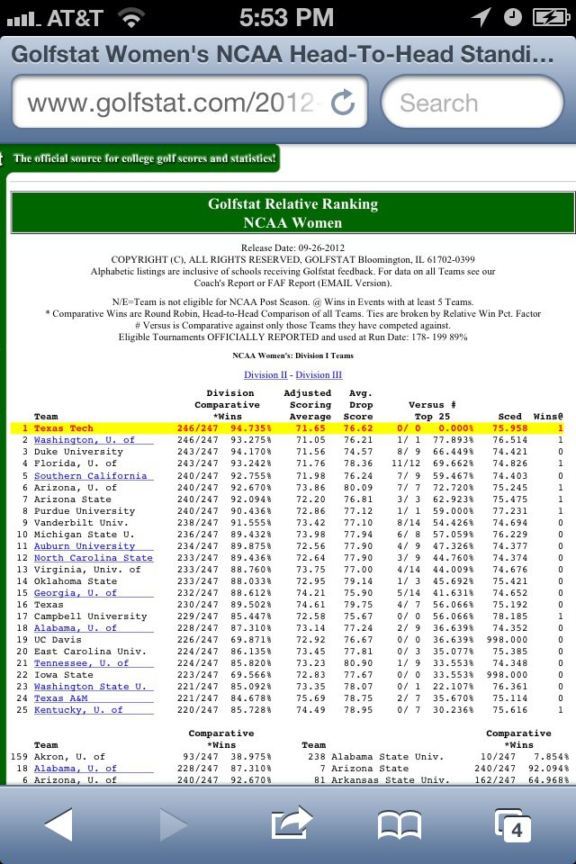Idag kom den efterlängtade första rankinglistan från Golfstat, vilket är en av de två statistiksidor som används på college, den andra är Golfweek. När Golfstat publicerades för första gången för detta tävlingsåret hade vi precis blivit tvunga att avbryta spel för åska och regn och hade blivit mer eller mindra inlåsta i klubbhuset eftersom vädret var så dåligt. Det blev ett stort jubel när coach JoJo visade oss listan och killarnas coach Greg Sands var inte sen med att sätta upp den i killarnas omklädningrum för att visa att tjejerna faktiskt, efter bara en tävling, är rankade nummer 1 i landet! Greg gjorde det säkert för att sporra killarna, väldigt roligt!