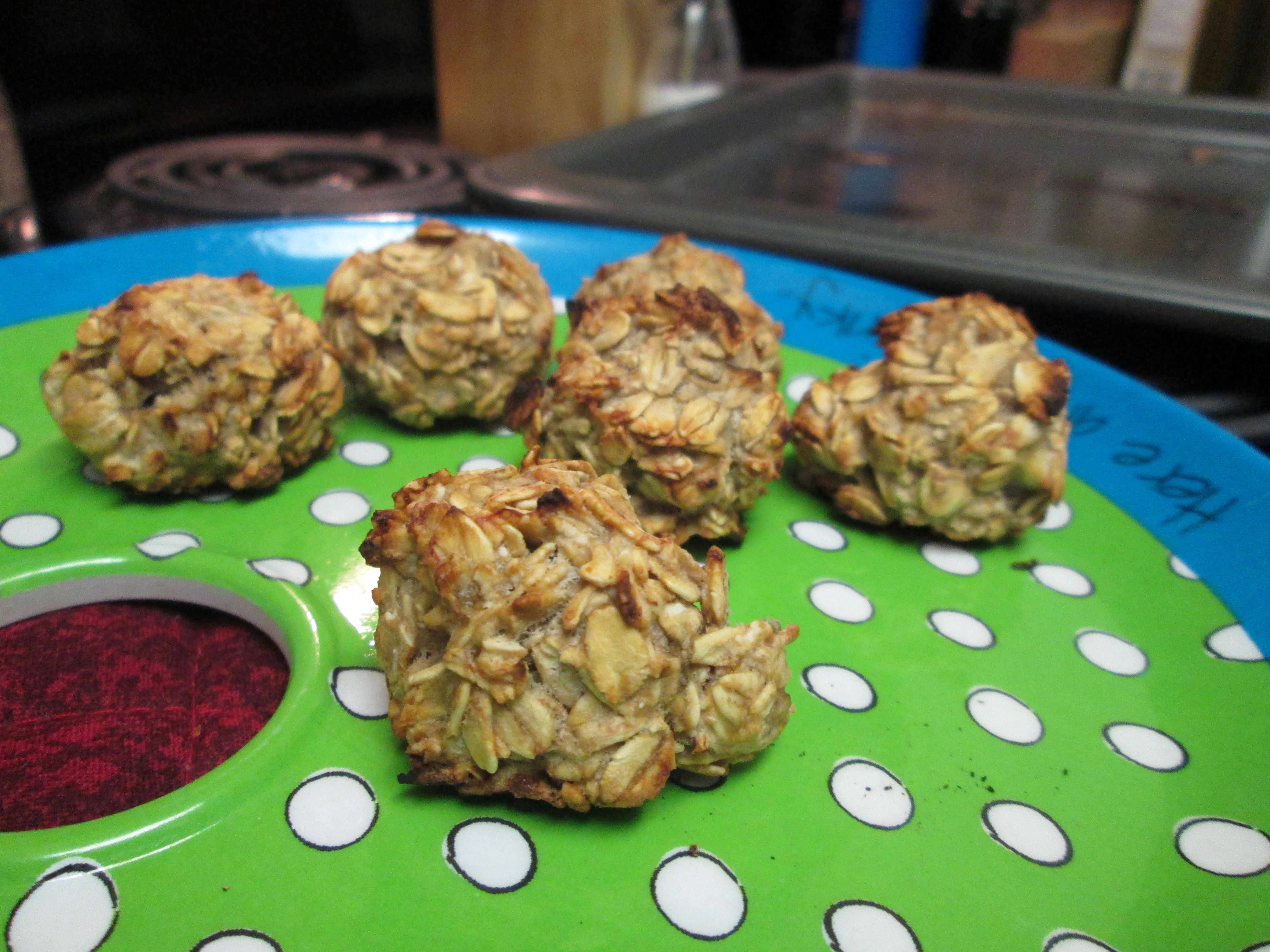 Idag såg jag något riktigt schysst i en tidning som jag tänkte testa. Man tar banan och mosar den, häller på havregryn, kletar ihop det, rullar det till bollar och sen in i ugnen! Det smakar som banankaka! Det var faktiskt gott, jag åt en när de kom ut ur ugnen men jag vet inte hur de kommer att vara när de är kalla, kanske funkar.